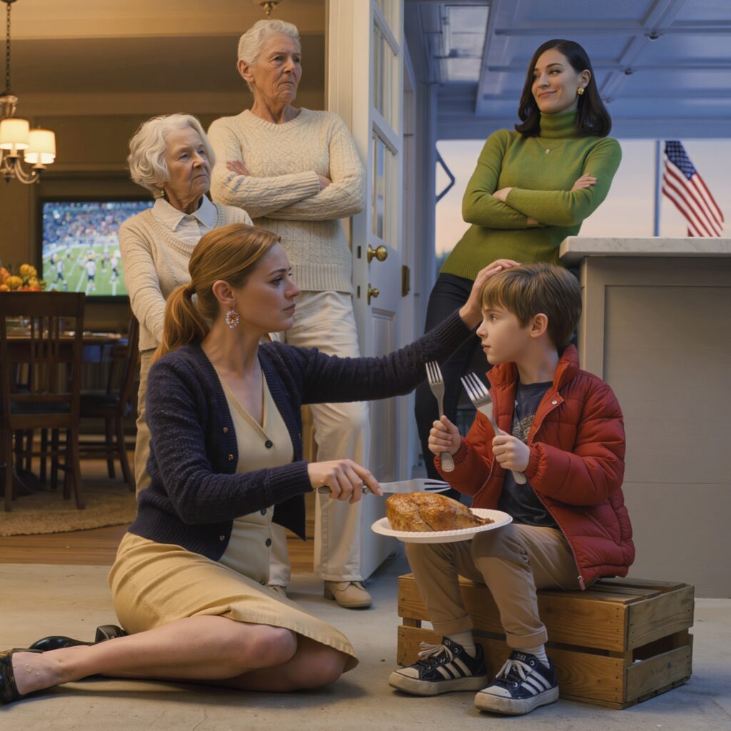 I stood frozen in the doorway between the dining room and the garage, watching my six-year-old son, Jacob, sit on an overturned crate near the trash can. He had a paper plate balanced on his knees, eating the leftovers my sister had scraped together for him. The garage smelled like oil and mildew, and the single bulb hanging from the ceiling barely lit the space. Jacob’s little legs dangled, his sneakers scuffed and worn, and he ate quietly like he was trying not to be noticed.